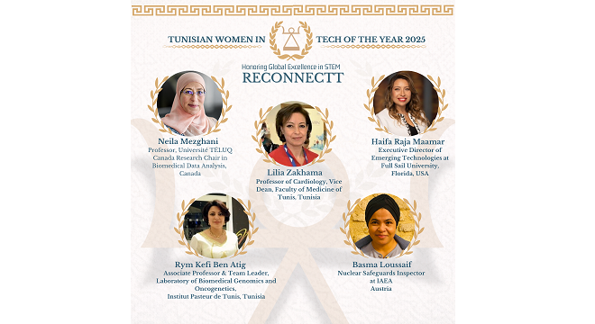 iT-News (Tunisian Women) – L’association tunisienne RECONNECTT, basée en France, a l’honneur d’annoncer la désignation des cinq femmes tunisiennes lauréates du prix Tunisian Women in Tech 2025, dans le cadre de la 4ᵉ édition de cette initiative dédiée à la valorisation de l’excellence féminine tunisienne dans les domaines des sciences, de la technologie, de l’ingénierie et des mathématiques (STEM).